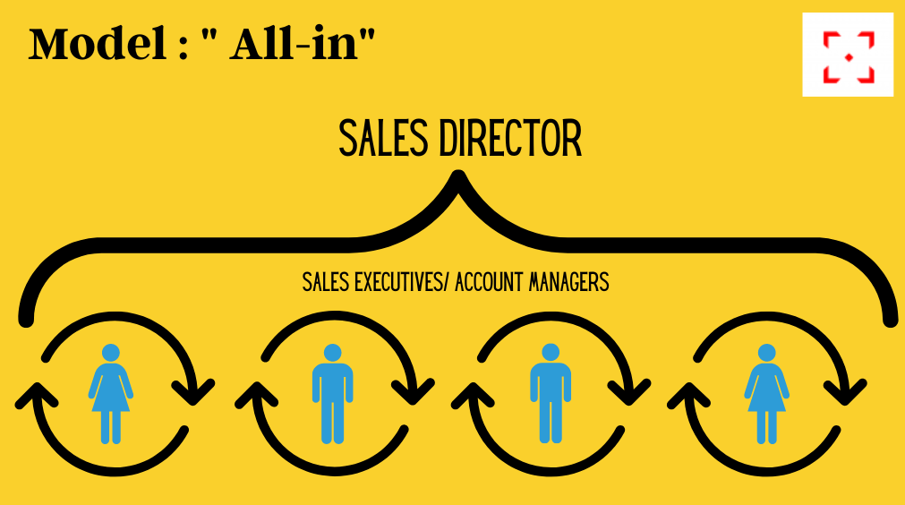 We sometimes speak of a “lone wolf” organization: in this model, the sales team is made up of generalists who manage each customer throughout the entire cycle: prospecting, closing the sale and post-sales support.