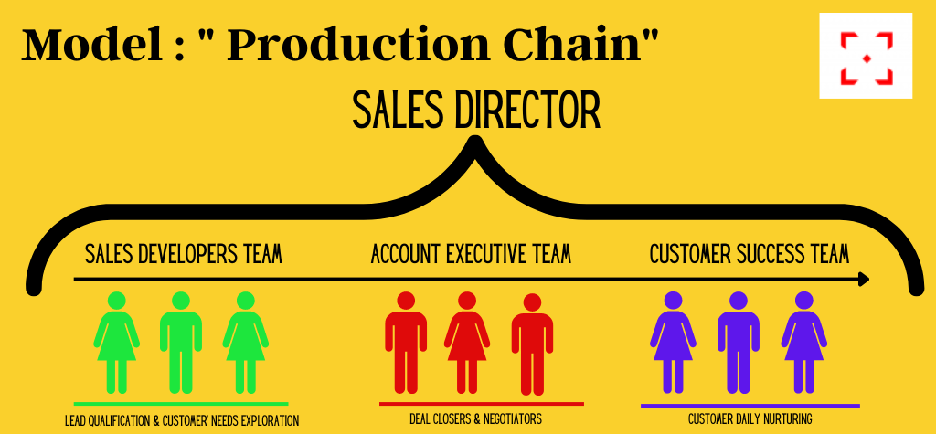 This model (also known as “hunter-gatherer”) is inspired by industrial production models, with sales teams specializing in a specific type of task, throughout the sales cycle.
